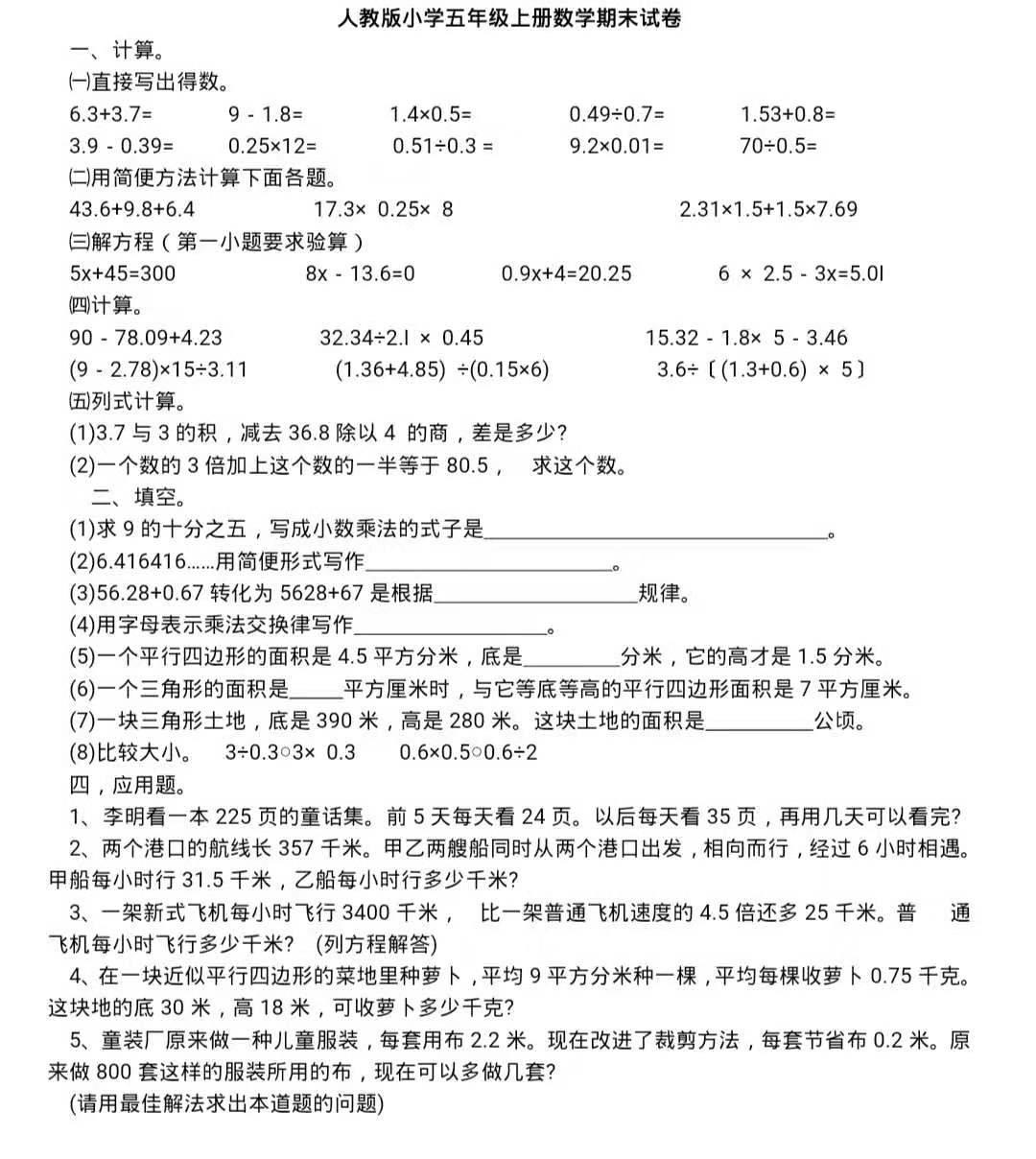 新万博体育下载:五年级上册数学期中试卷(十三)