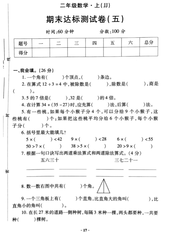 新万博体育下载:冀教版二年级上册数学期末达标测试卷五(图片版)