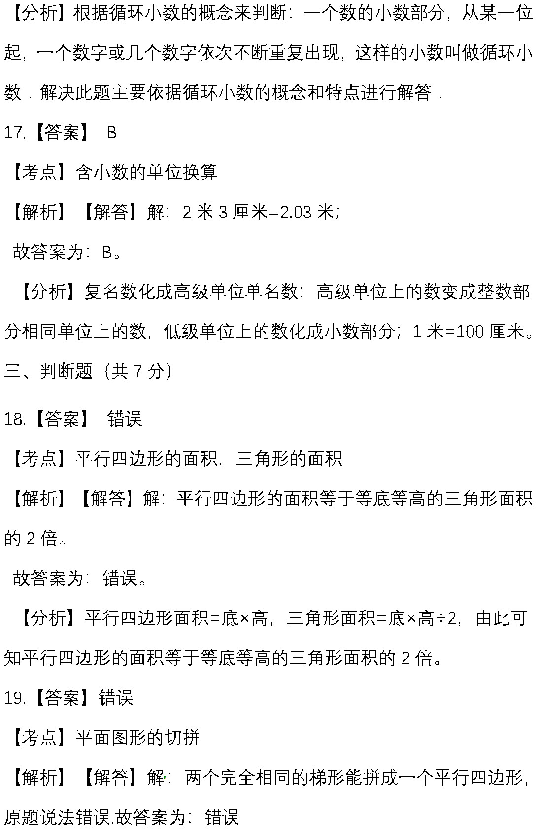 2020年人教版数学五年级上册期中测试卷五(答案)(7)