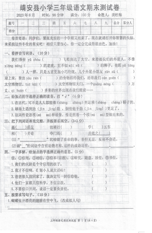 奥数网整理了关于2023江西宜春靖安县三年级下册语文期末试卷(图片版),希望对同学们有所帮助,仅供参考。